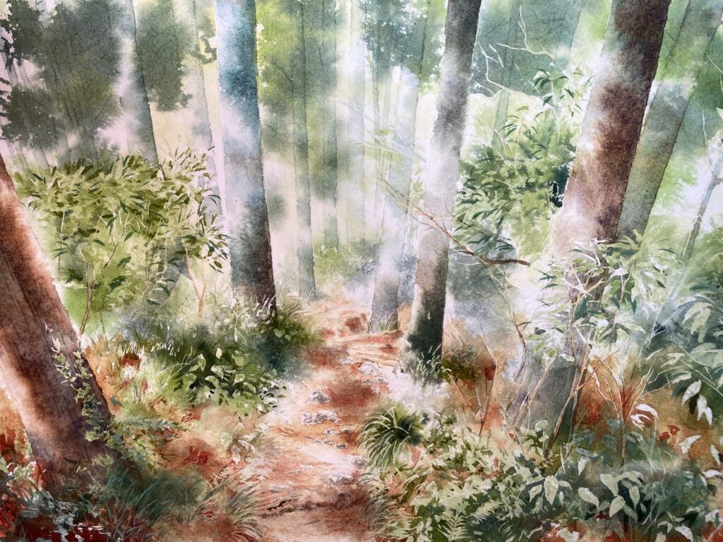 水彩のにじみを活かして、空気のゆらぎや木漏れ日のやさしさを描き出そうと試みました。