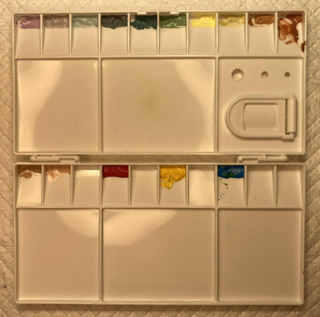 ただ、プラスチックは水気をはじきやすく、パレットの混色スペースで色を広げたときに、絵の具が一面に薄く広がらないのが少し不満でした。