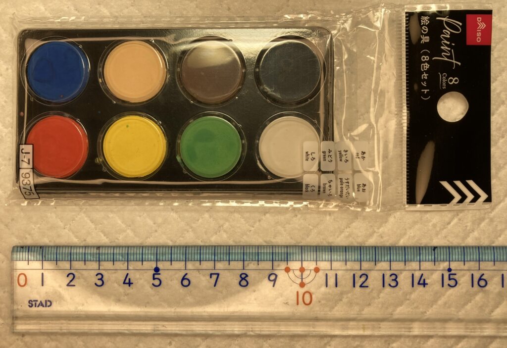 そこいくと、ダイソーの絵の具は、赤は「あか」、黄は「きいろ」とハッキリ書いてありました(笑)。ただ、青と思って買ったのは「そらいろ」と書いてありましたよ(※注)