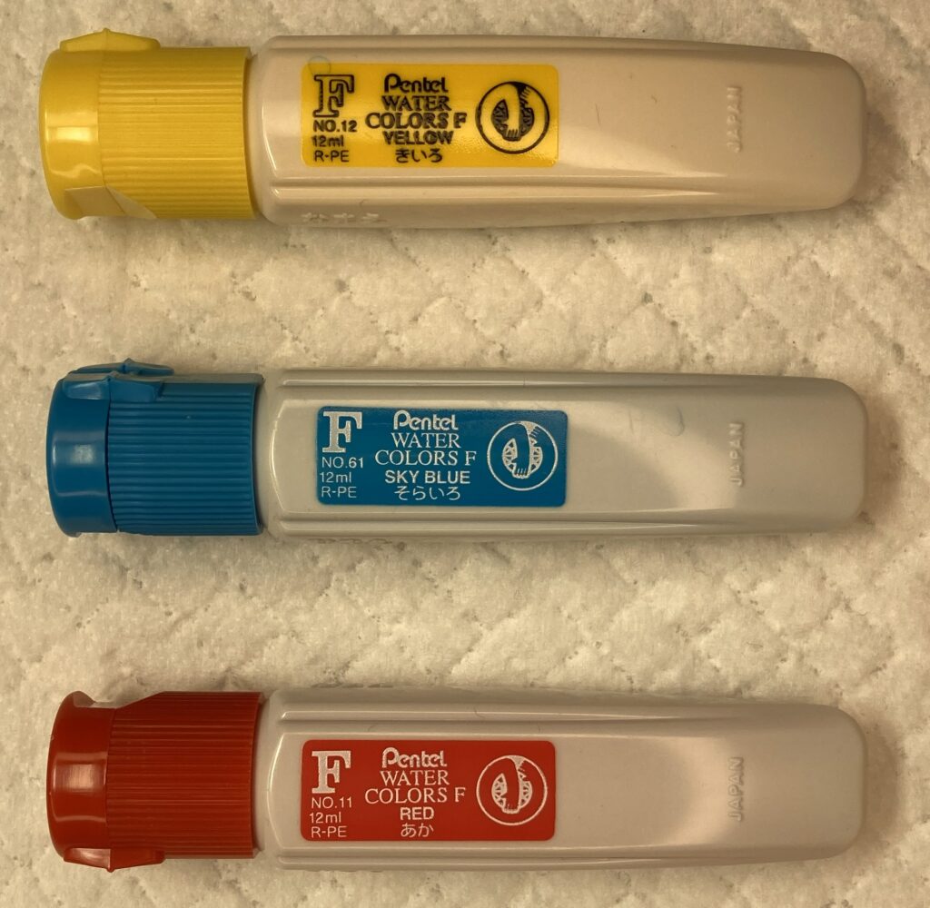水彩では、赤・青・黄の3色があれば、ほとんどの色が作れますので、まずはこの三色を買いました。