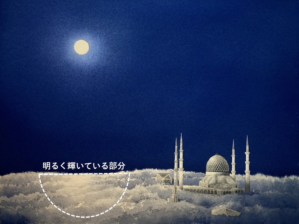 月に向いている左斜め上の所を塗り残して、右斜め下に向けて暗く濃く塗ります。