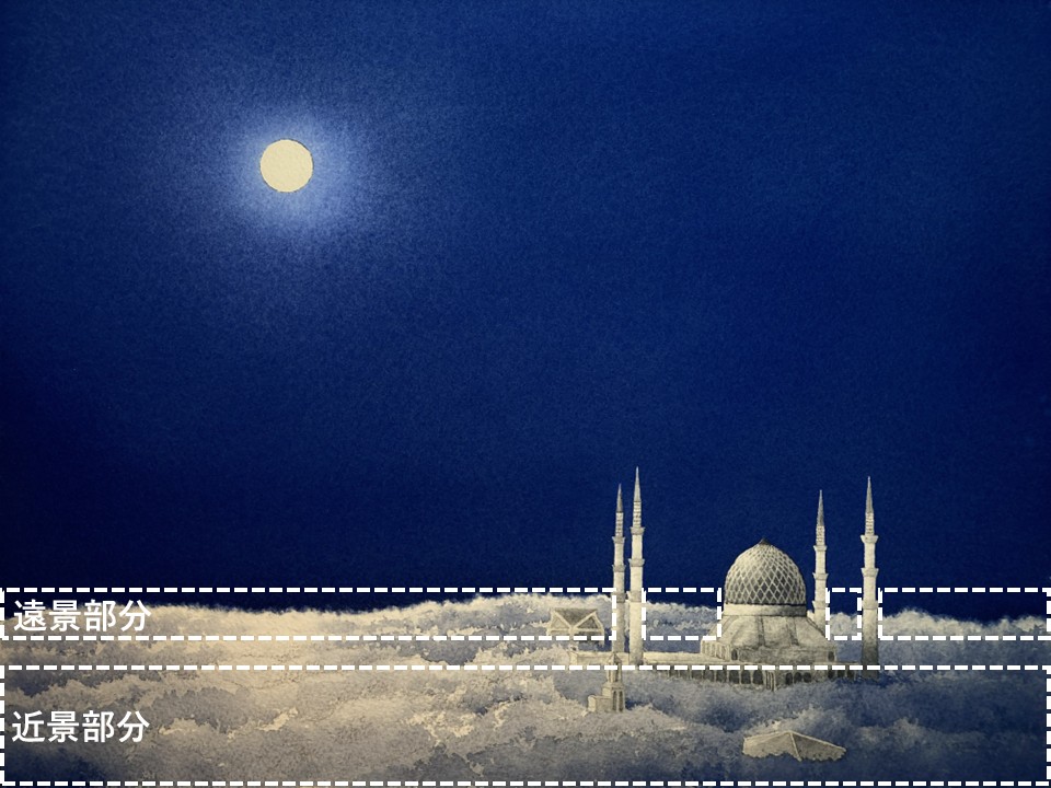 今回の絵ですと、月と森と建物の部分にです。