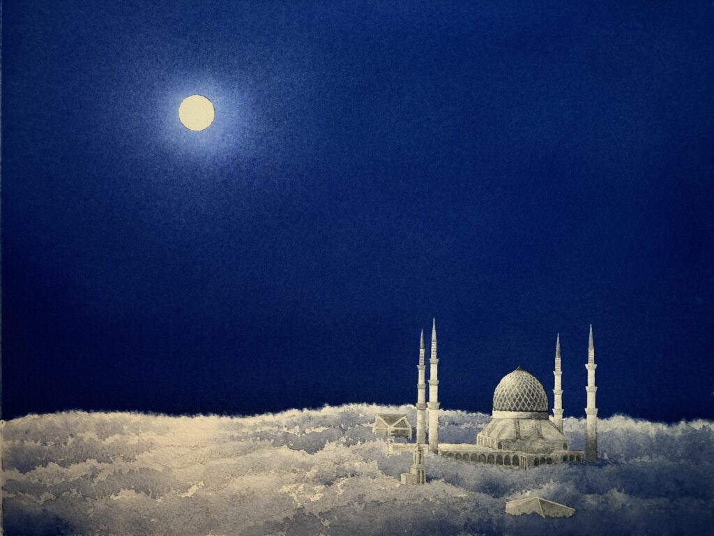 水彩ならではの透明感を活かしながら、穏やかな月明かりの広がる空を描いてみました。