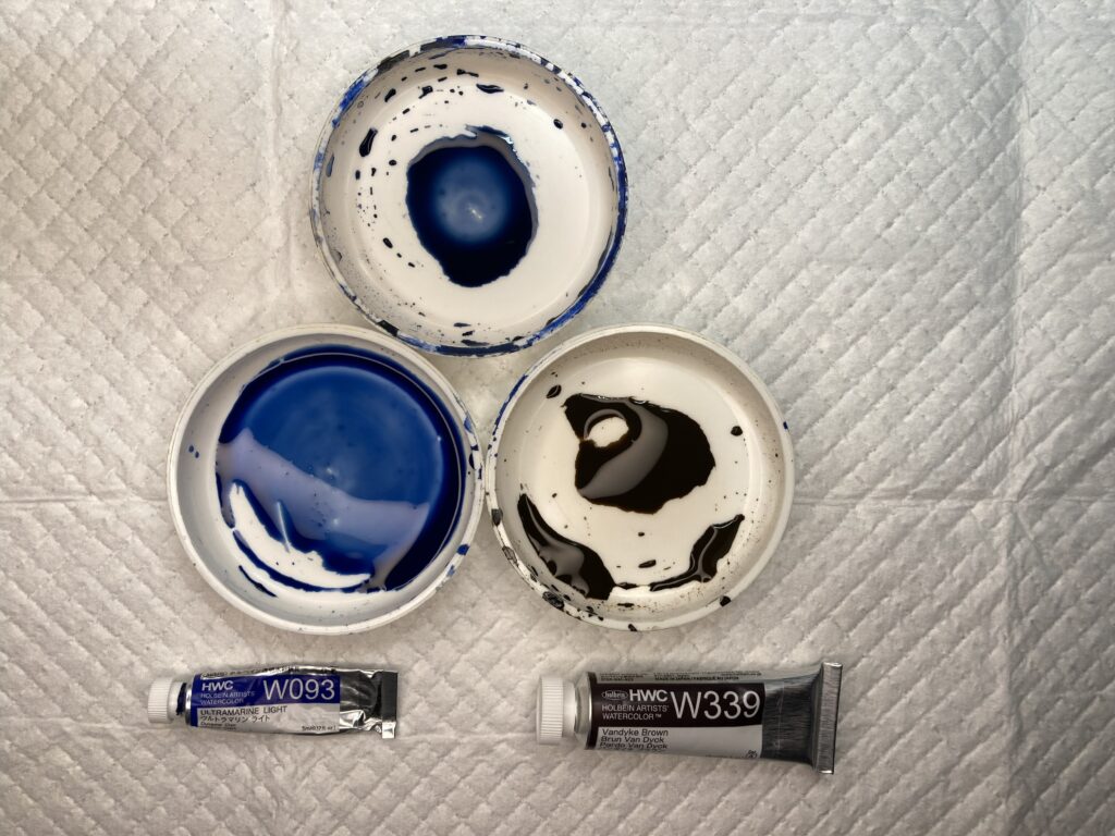 濃く暗い箇所を塗るときには、ウルトラマリンライトに対するヴァンダイキブラウンの量を増やした色を作りました。