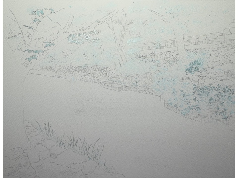 今回の題材では、より近い川面の薄い色をまず塗り、中景から近景にかけての緑の茂み、遠景から近景にかけての石垣、お堀の向こう側の木々の茂みです。