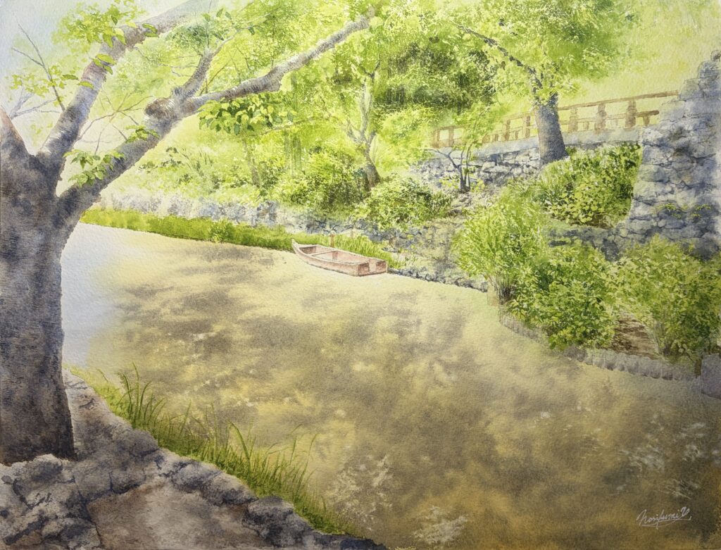 今回は、新緑の木々が水面にやわらかく影を落とす印象的な一場面を描きました。