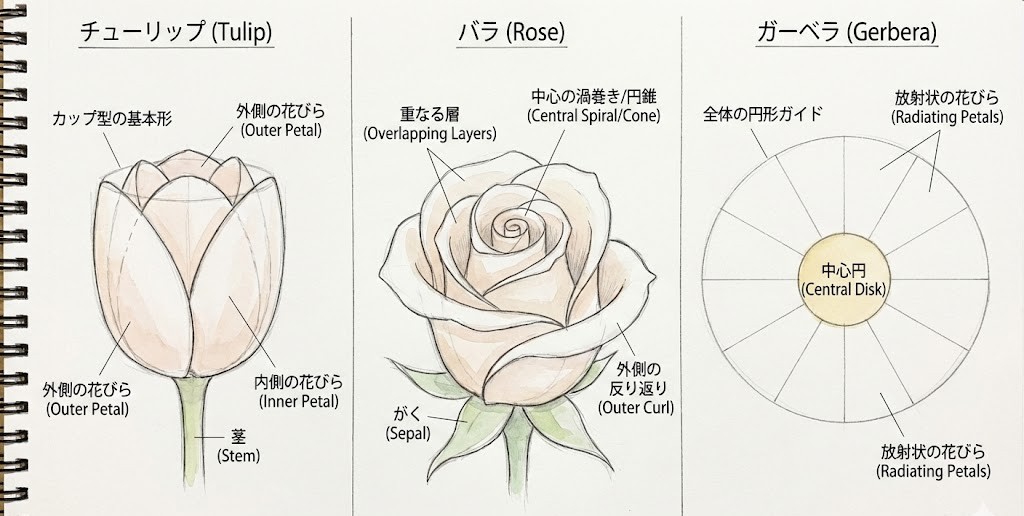 初心者の方が、いきなり複雑な形の花を描こうとすると、細部に意識が向きすぎて、全体の形が崩れてしまいがちです。そのような場合は「花を単純な幾何学図形として捉える」と描きやすくなります。