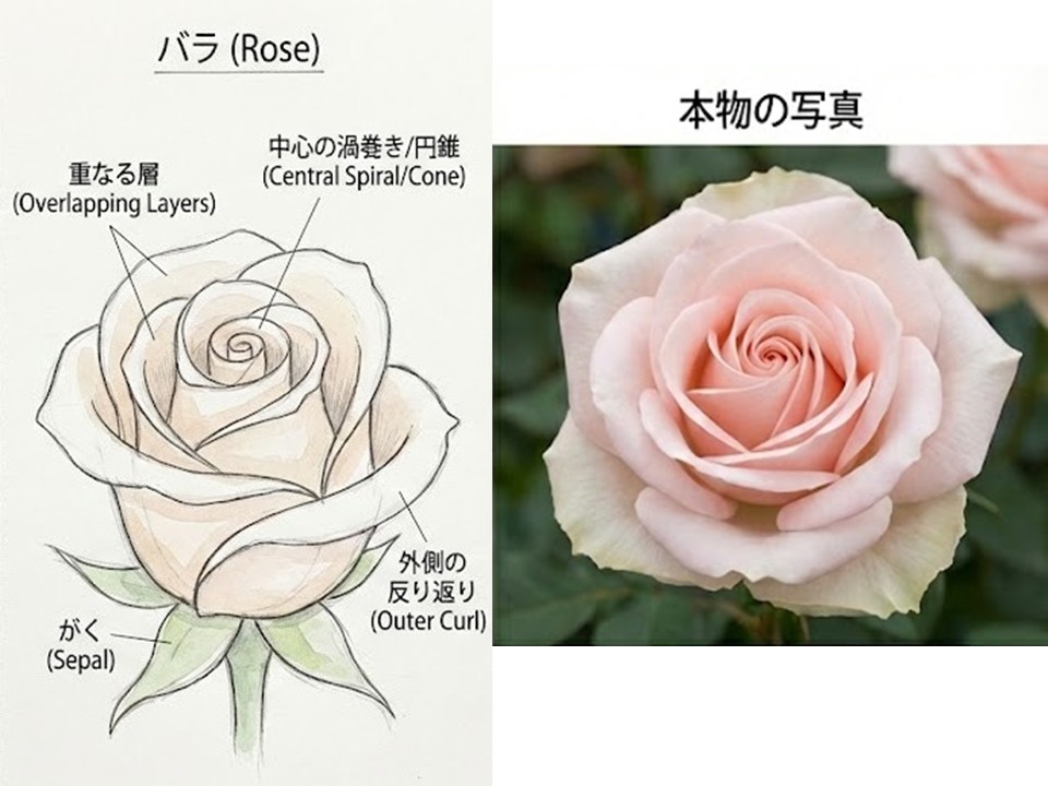2. バラ:複雑な「渦巻き」と「円錐(コーン)」として捉える