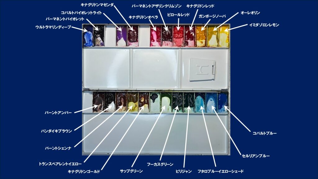 これは、「この色があれば、あとは混色で何とかなる」という経験に裏打ちされた選択なのだと思いますし、作家さんそれぞれで得意とするモチーフがあるために、よく使う色が限られるからではないでしょうか。僕自身もよく使う色となかなか減らない色がわかれます。