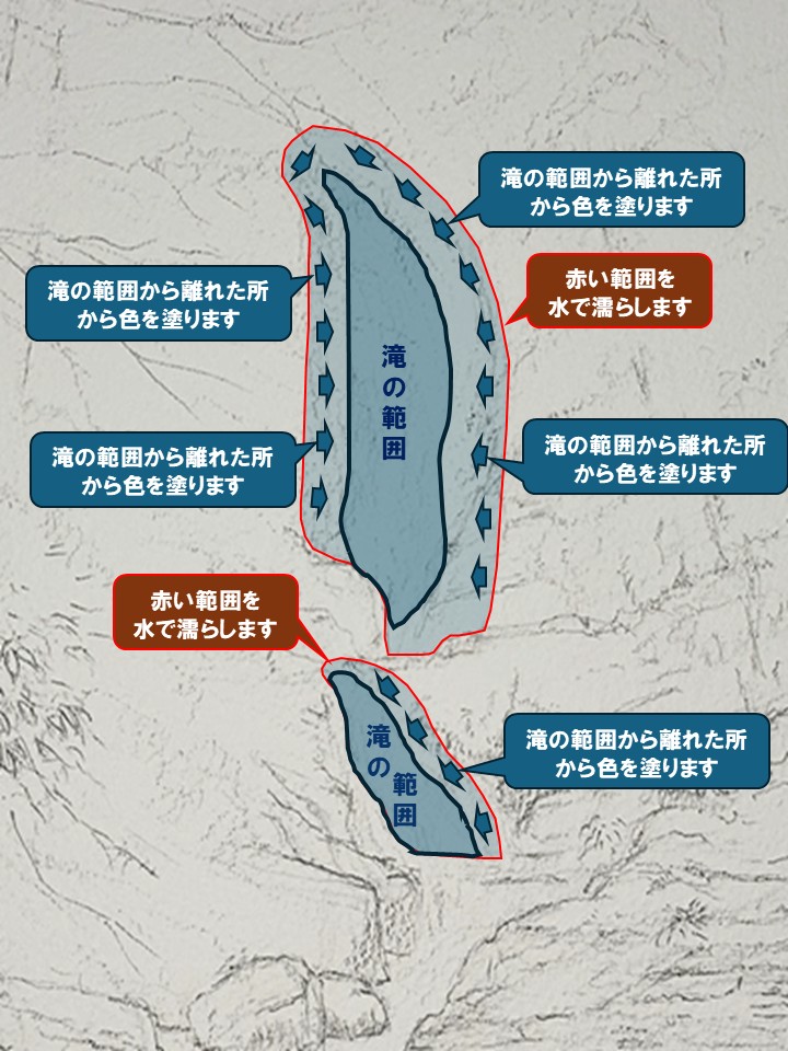 なので、滝の輪郭付近で滲みを止めるには、滝から遠い箇所からじわじわと近づけながら、塗る