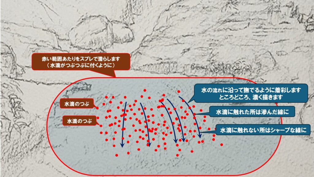 今回の着彩のポイント2(近景の落水)