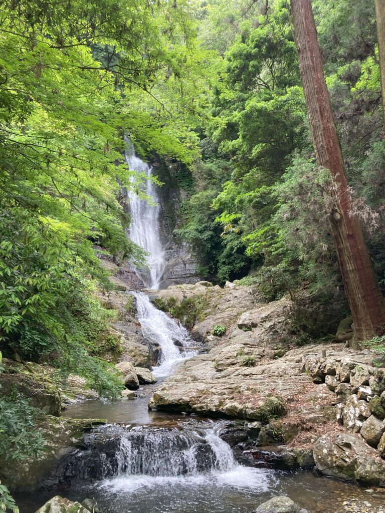 そして、空を覆うように杉などの木が滝の脇から手前に向かって生い茂っています。